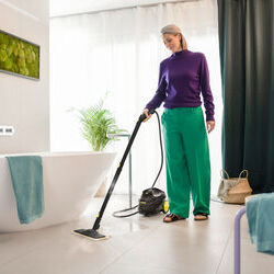 A Kärcher SC 3 EasyFix GNF Edition fekete gőztisztító gyorsan használatra kész, és hatékonyan eltávolítja a vírusokat és baktériumokat kemény felületekről. Az EasyFix padlófej rugalmas csuklóval és lamella-technológiával biztosít ergonomikus tisztítást, a Re!Fibe kendők újrahasznosított poliészterből készülnek, a flexibilis kézi fúvóka pedig a makacs szennyeződéseket is könnyen eltávolítja. Az állandóan tölthető víztartály és a vízkőmentesítő patron megszakítás nélküli, hosszú élettartamú használatot garantál.
